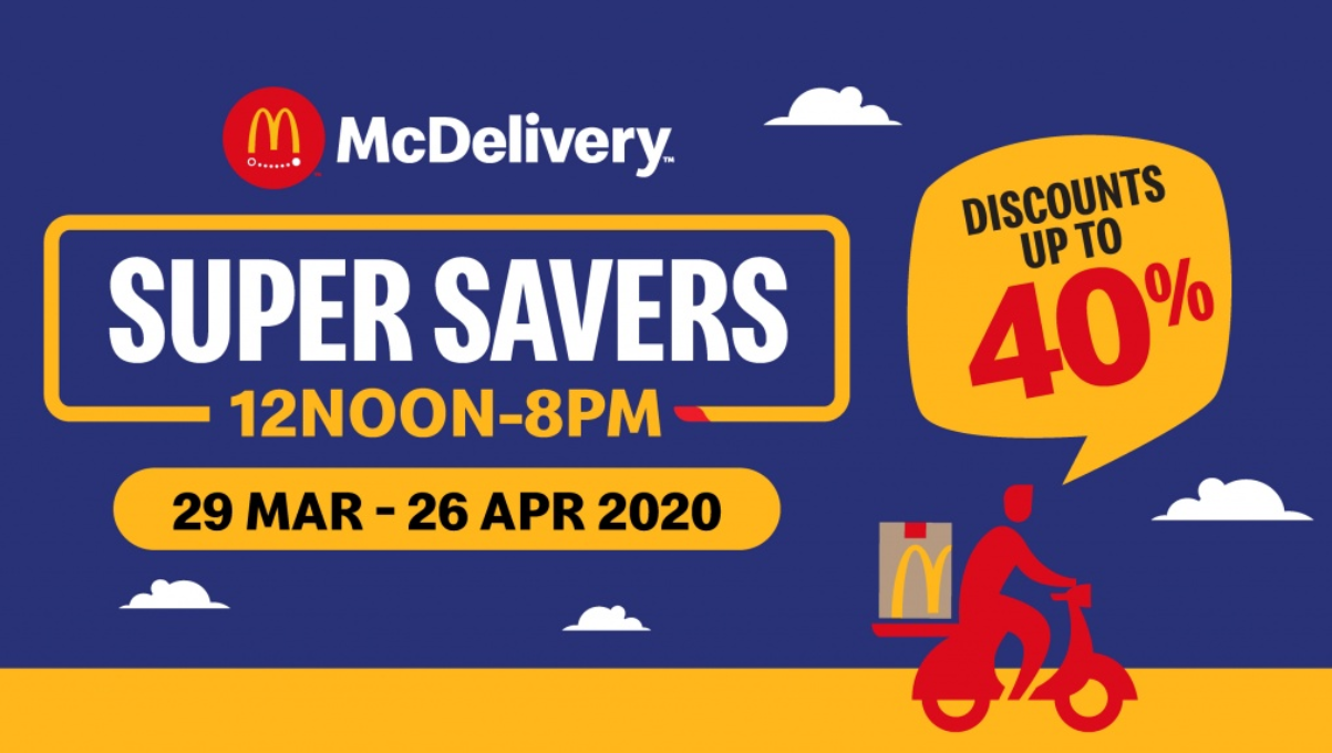 麦当劳推出「Super Savers」美食大优惠。只要通过 McDelivery 订购麦当劳的指定套餐就可享有40%折扣优惠!