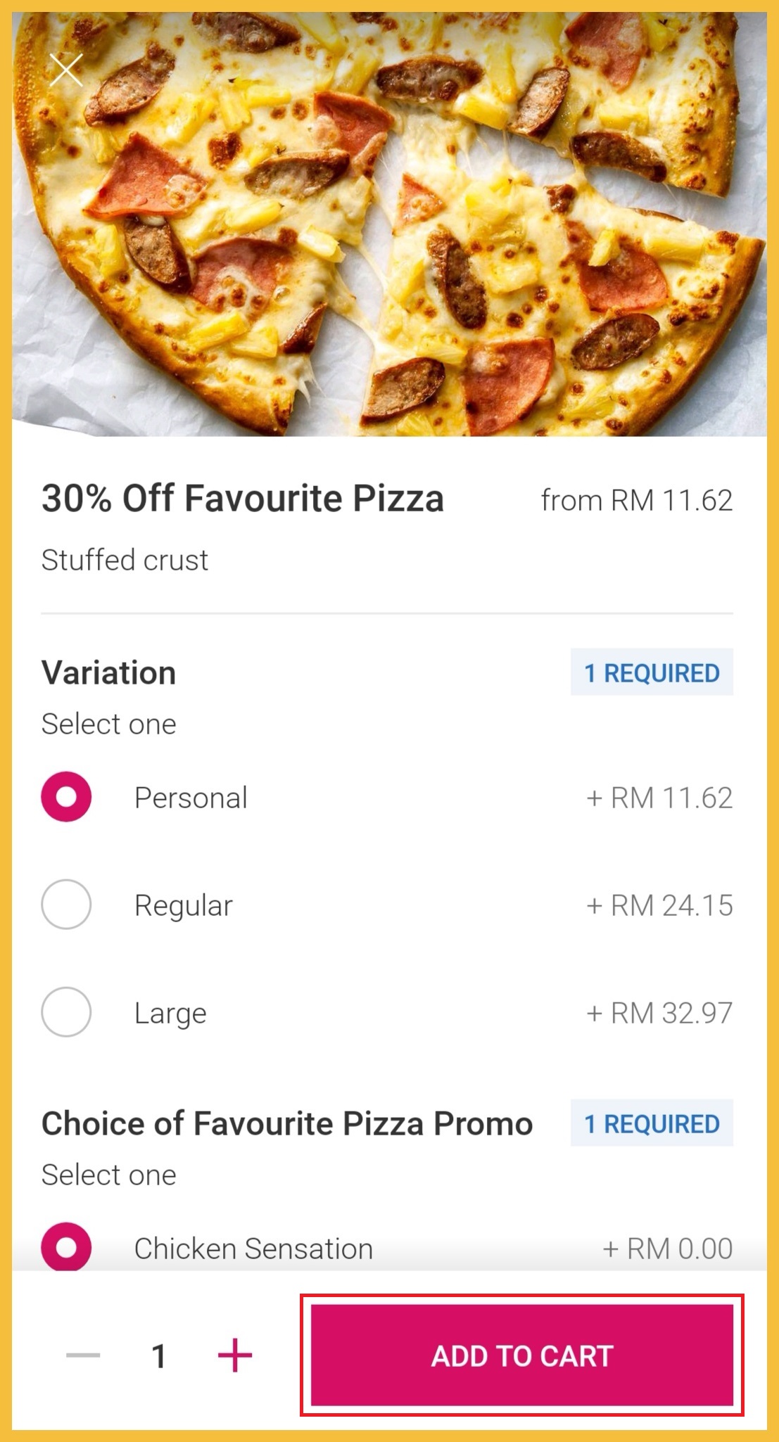 步骤 2:选择餐点。比如:点上「30%Off Favourite Pizza」。