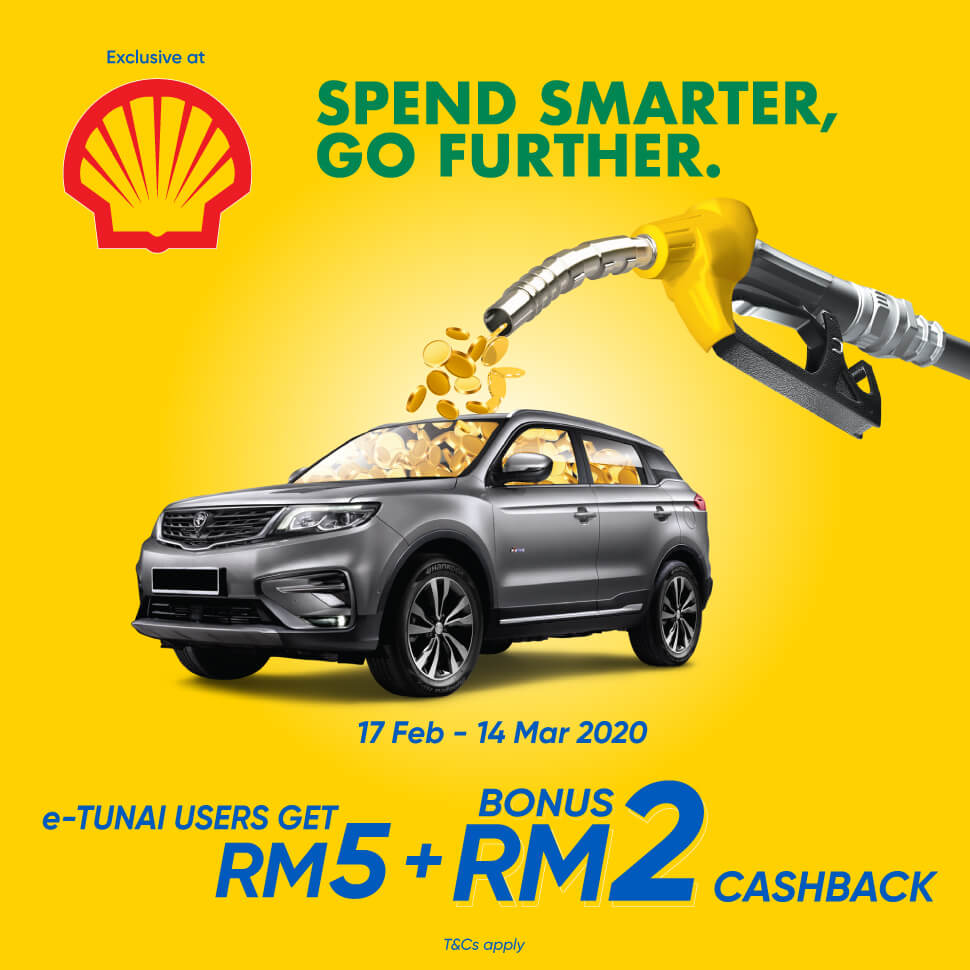 促销活动:Shell —— 消费RM20可获得e-tunai 用户RM5 + 额外RM2现金回扣