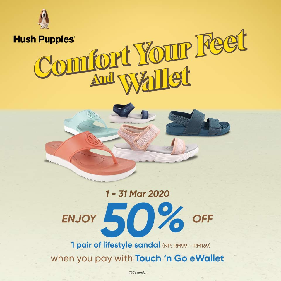 - 购买一双价值 RM99 至 RM169的 Hush Puppies Lifestyle Sandals (non-leather) 鞋子可获得50%折扣(不包含6%SST 税)