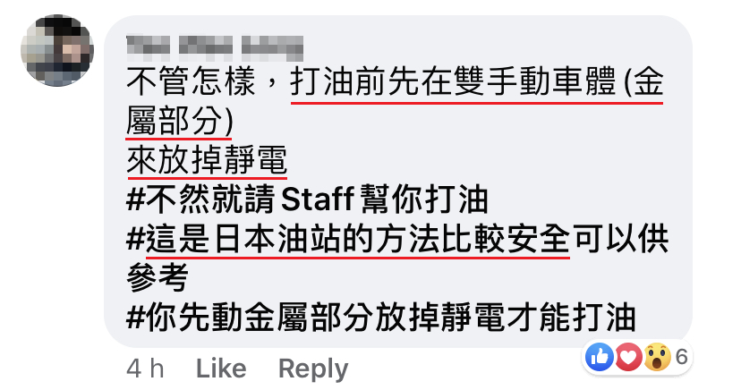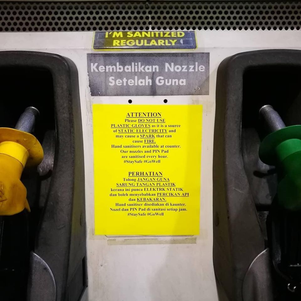 「注意!请不要戴着塑胶手套添油,因为这样的行为将产生静电,可能引起火花并酿成火患。柜台有提供洗手液,我们的油枪握把和密码按钮也会每小时消毒一次。」