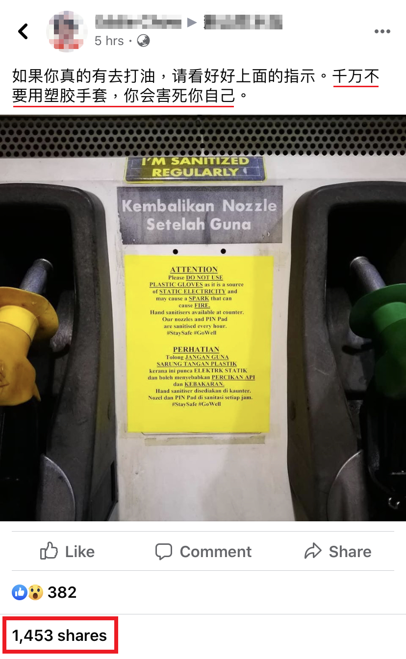 然而,今天一名大马网友就在面子书PO文分享,大马的某家油站发出通告提醒民众:戴着塑胶手套添油,恐怕会引发着火!