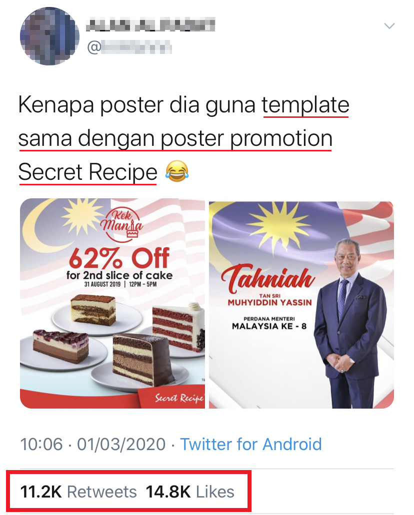 然而,该祝贺图很快的就成了网友们的热门话题。一名大马网友意外发现,这张祝贺图的背景竟然和大马连锁甜品屋 Secret Recipe 的促销图,几乎完全相似!