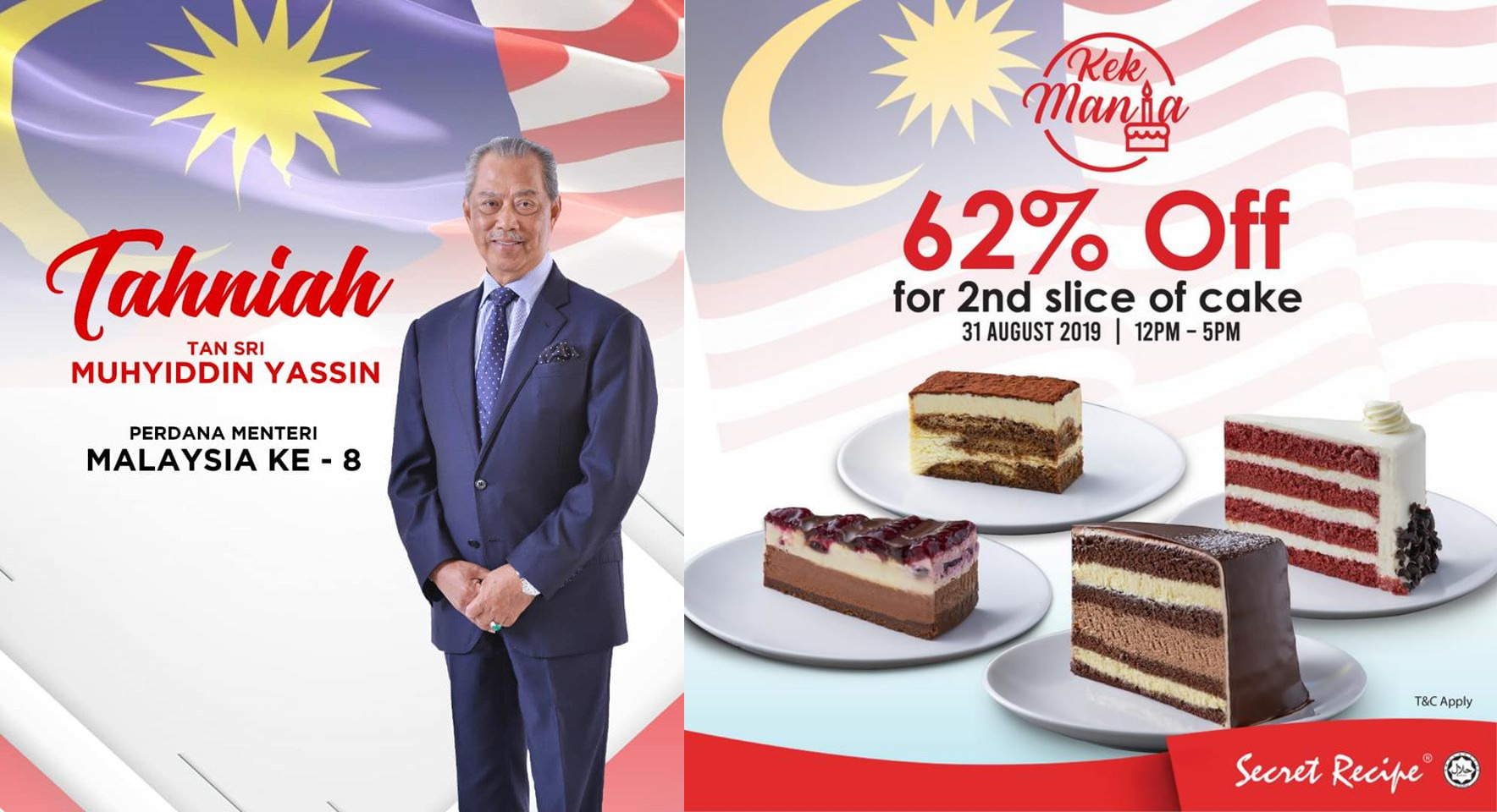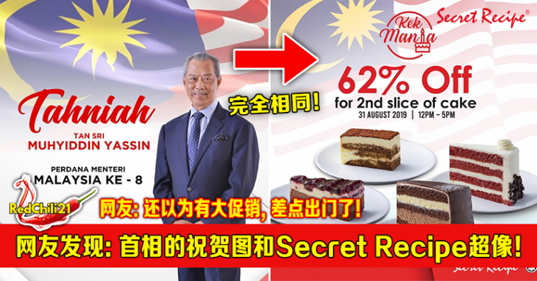 和首相的祝贺图“撞图”的是 Secret Recipe 去年(2019年)的国庆日促销海报,背景同样都是大马的国旗,壮丽地飘扬着。