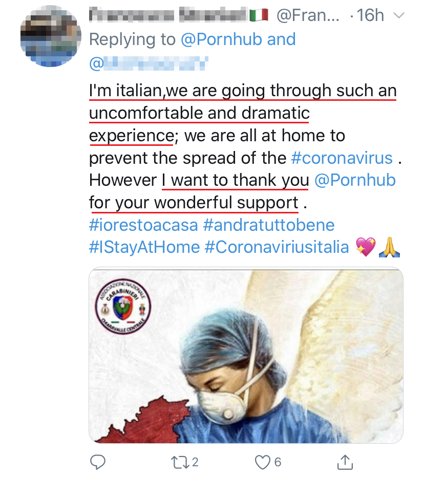 此外,Pornhub 也在 Twitter 帖文里表示:为了协助意大利对抗新冠肺炎的疫情,Pornhub 决定将他们的子公司 Modelhub 3月份收入,捐款给当地的医院,为抗疫尽一分力!