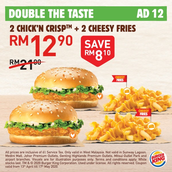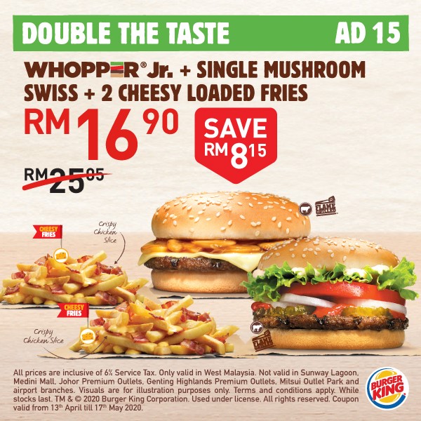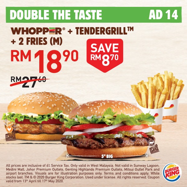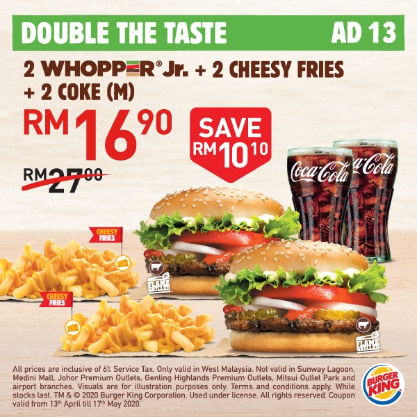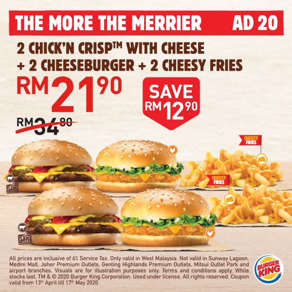 Burger King 又推出大促销!从即日起,大马 Burger King 推出「20个美食超值优惠」给大家啦!一份汉堡只需RM4!而且还免费送出2种口味的 Pie 给你哦!