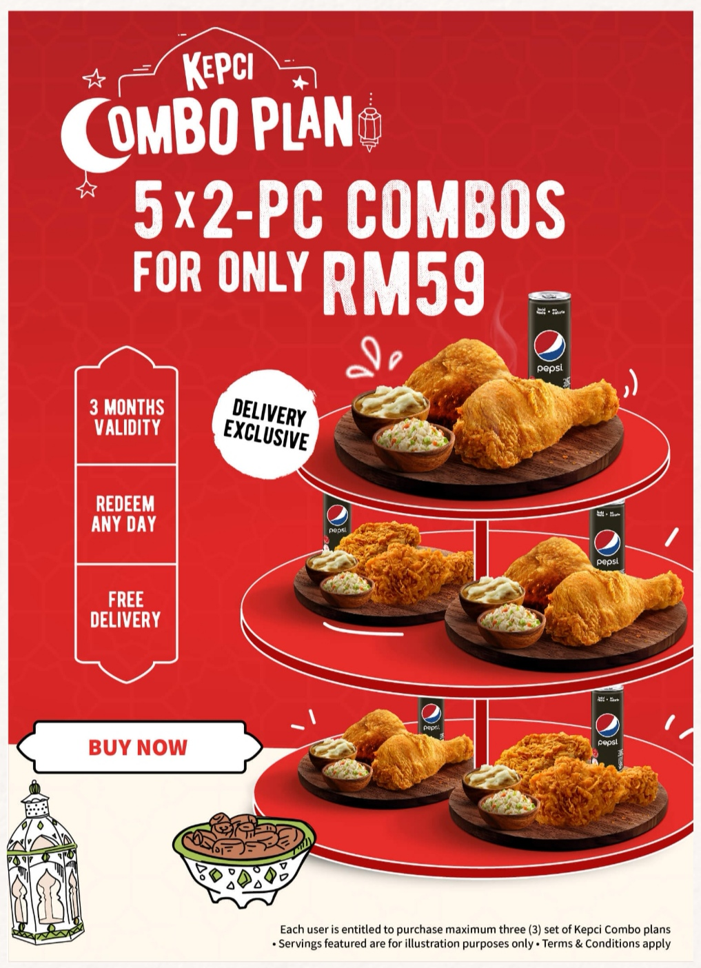 为了欢庆开斋节的到来,大马 KFC 推出【Kepci Combo Plan】 特别优惠!在这项优惠套餐中,共有5份2块炸鸡套餐,而且售价只需RM59!相等于2块炸鸡套餐只需RM11.80!还免邮费服务!