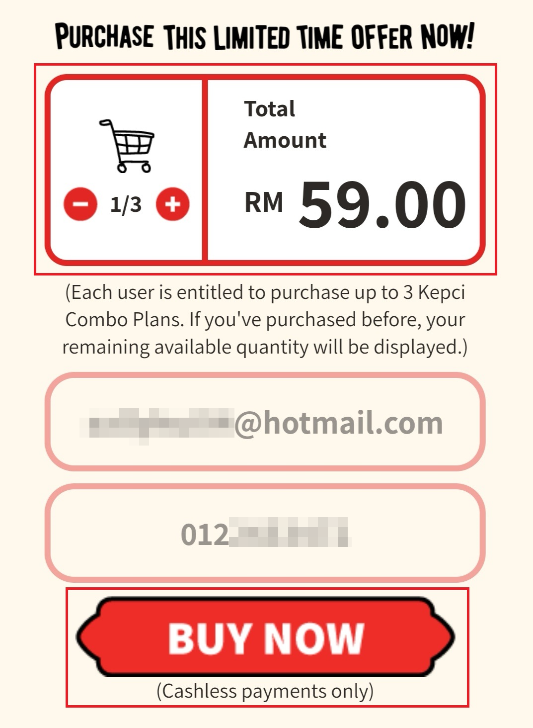 ※ 你会发现一份【Kepci Combo Plan】套餐只需RM59!若你想添购套餐,可点击红色加(!(最多只能购买3份套餐)
