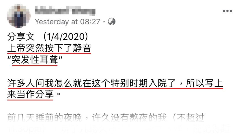 许多年轻人习惯性熬夜,总认为自己还年轻,熬夜没什么的!然而近日一名大马网友发文分享自己的经历,毫无预兆的患上了“突发性耳聋”,导致他差点永久性失去听觉!