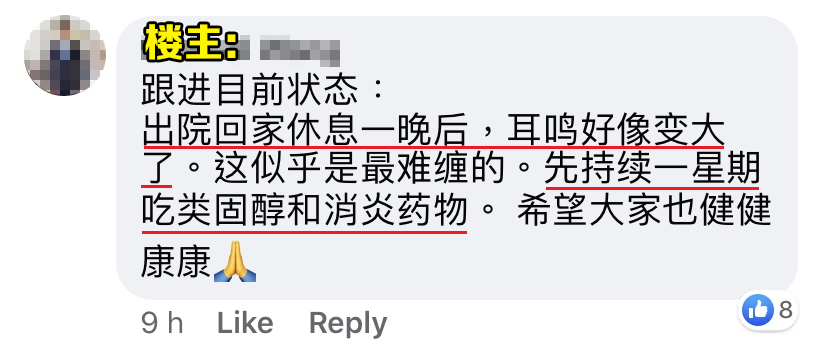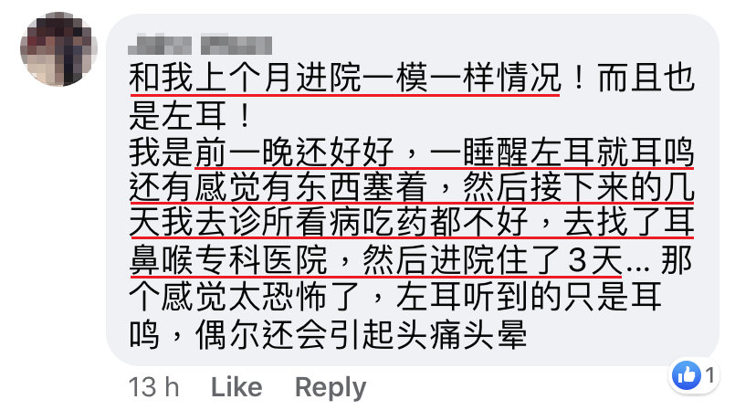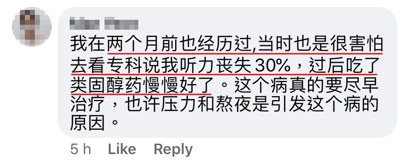 当时,我的左耳听力下降到了,甚至听不到狗吠的声音。只是一个晚上,我的左耳几乎变聋。医生也证实这个疾病必须早治疗,所以安排我入院注射类固醇,留院观察。
