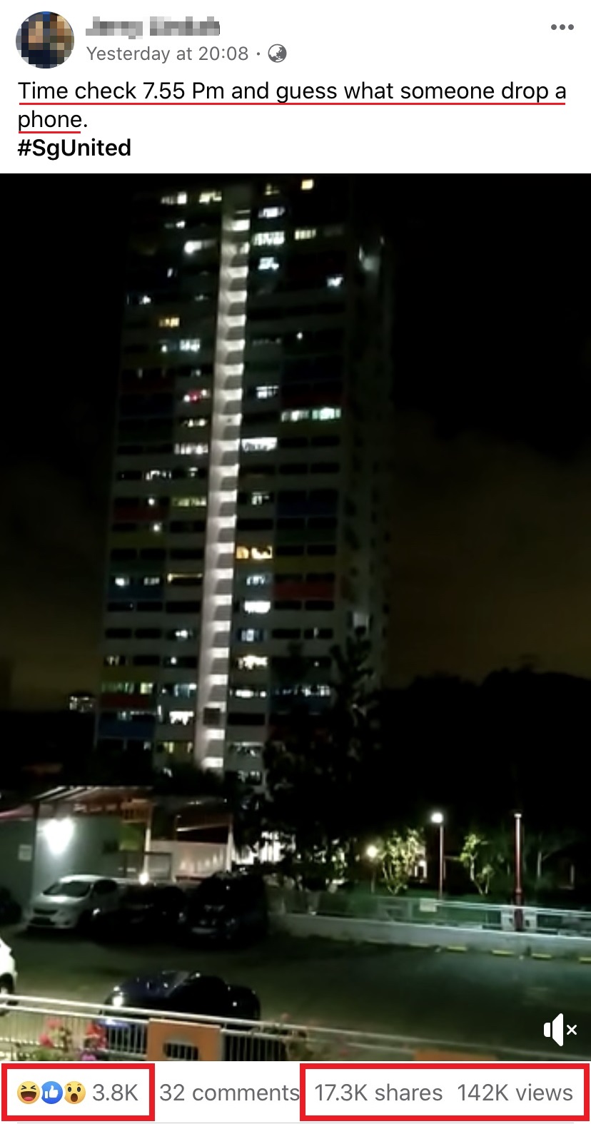 然而就在昨天晚上,一名来自新加坡的网友在社交媒体分享一段视频,一栋公寓里的主人在参与该活动的时候,不小心把手机“坠楼”了,一台手机从超过10层楼的高处摔了下来!该视频在短短的12小时内就多达1万7千人转发!
