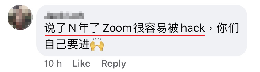 - Hacker 很容易进入任何一个 meeting,因为 Zoom 是只要有 link 就可以进到了的。 之前就有新加坡的学生上课,有 hacker 进去了在里面播放色情影片,所以教育部 ban 了 Zoom。
