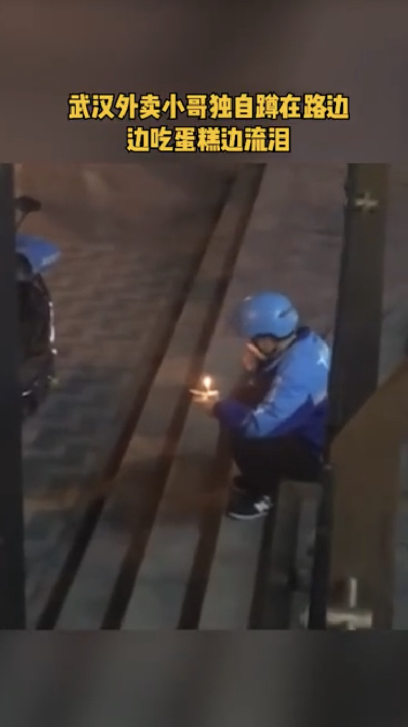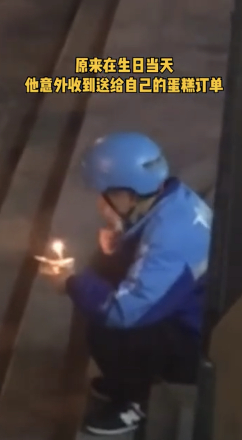 ▼ 从影片里可以看到,外卖小哥独自坐在台阶上,手中拿着生日蛋糕。吹灭蜡烛以后,心存感激的他忍不住流下了男儿泪。