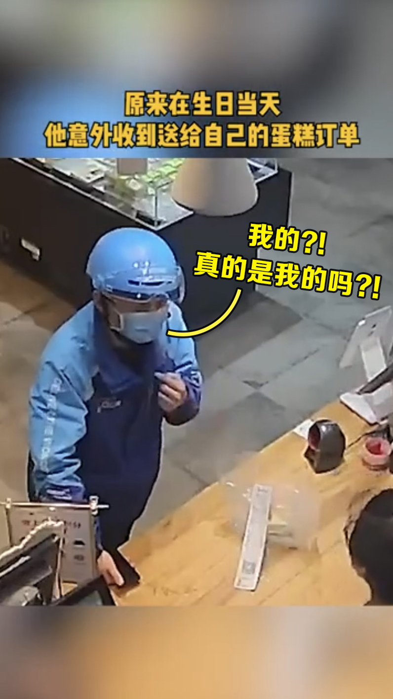但外卖小哥万万没想到,当他来到面包店的柜台时,店员告诉他该客人订购的生日蛋糕是送给他本人的。