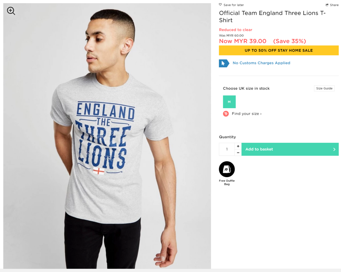 ▼ Official Team England Three Lions T-Shirt – 只需RM39(原价RM60)!