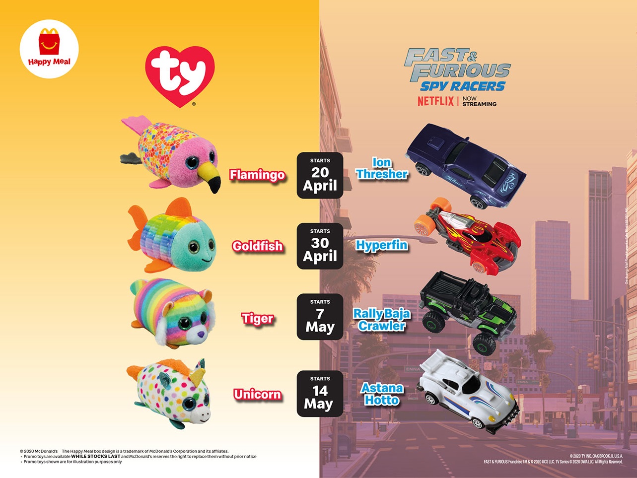 只要购买任何一份 Happy Meal 套餐,即可获取这2种系列的玩具!而且将会送出8款【TY】和 【Fast & Furious】系列的玩具给你哦!