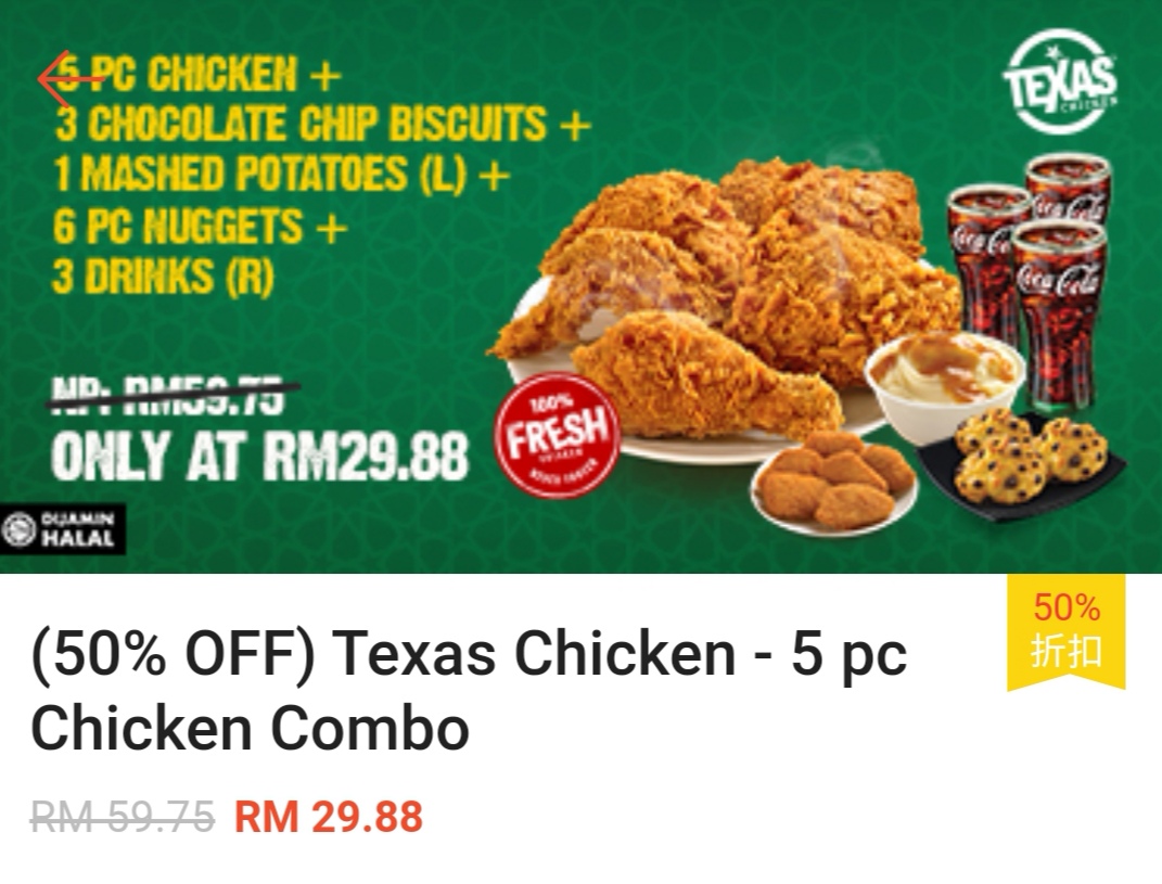 为了配合斋戒月的到来,大马 Texas 与著名网络购物平台 Shopee 推出超值优惠券!烟熏烤鸡饼皮套餐、炸鸡套餐及新推出的巧克力曲奇饼都在这项优惠中!