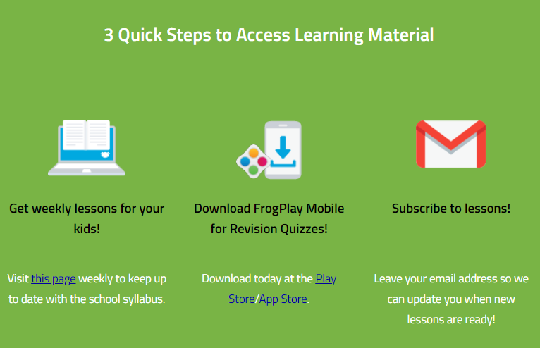 学生可通过 FrogAsia 的网络课程来学习。在这个网站将会有一年级至五年级的课程,其中包括的科目,如:英文、数学及科学等等。