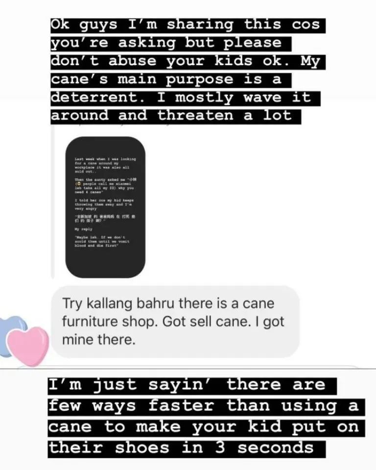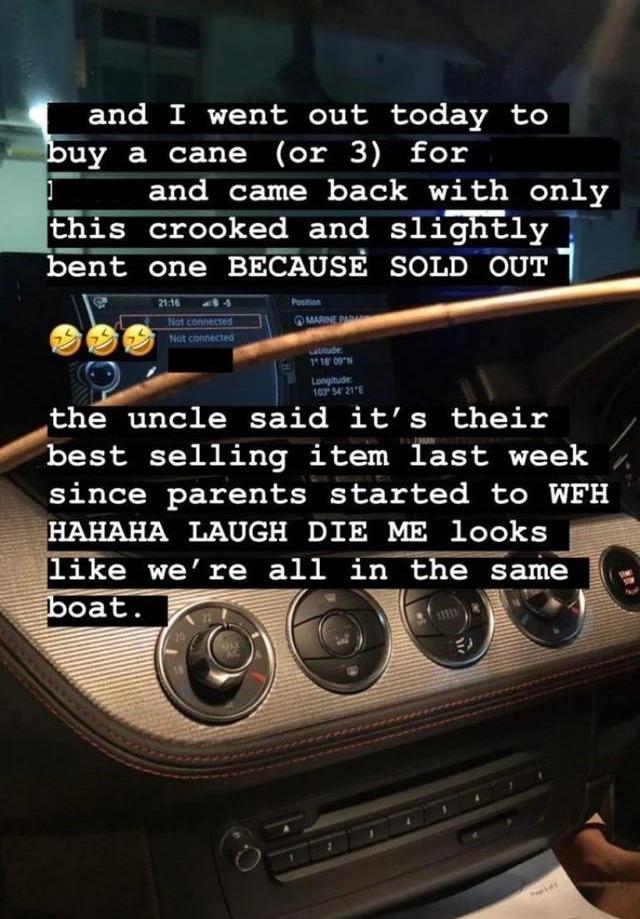 新加坡一名母亲在 Instagram story 发文写道:「今天我出门去购买藤条,结果发现藤条已经卖完了。」