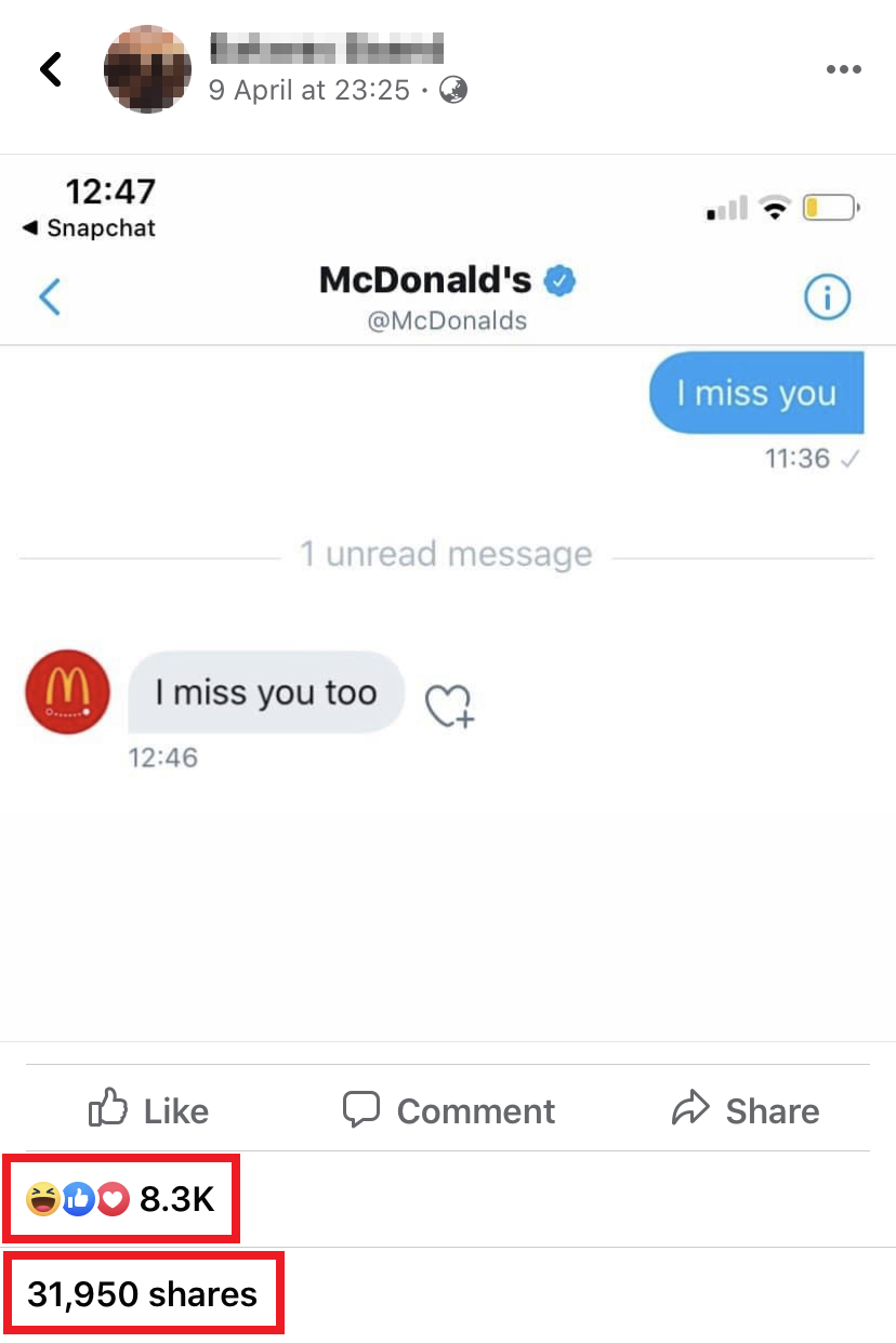 该帖文在网上流传以后,当然就引起了网友们的好奇心,纷纷也私讯其他著名快餐店,并说:「我想你了。」然而并不是每一家快餐店都给出了相同的答复,让网友们哭笑不得!