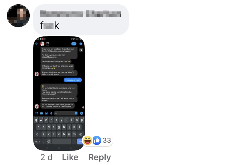 KFC面子书的回复笑翻了许多网友,但同时也让收到这样回复的网友“气得”爆粗话!(哈哈!)