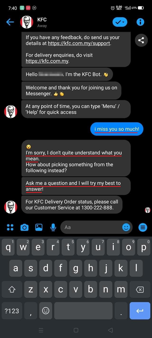 ▼ 不过这名网友就没那么幸运了,激动地和 KFC 说:「我很想你。」结果 KFC 回复的是: