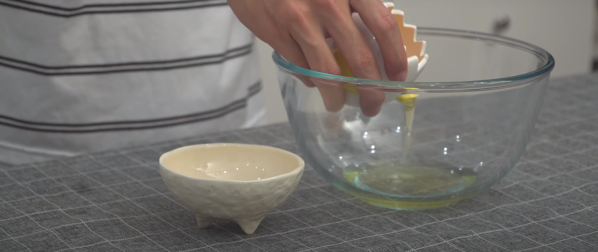 步骤1:取2颗鸡蛋,将蛋白和蛋黄分开,并分别倒在两个碗中。