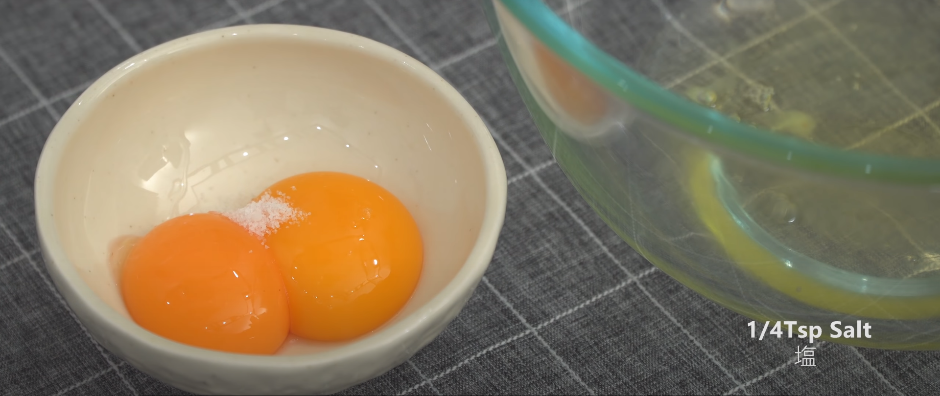 步骤2:加入1/4 茶匙的盐在蛋黄里,将蛋黄弄散后搅拌均匀。