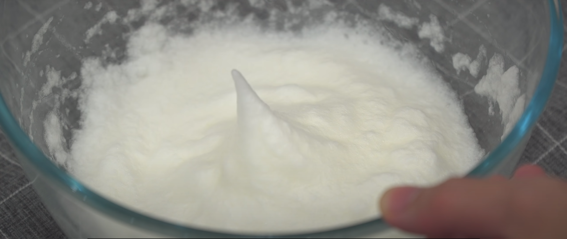 步骤3:在蛋白里加入1茶匙的糖,开始打发蛋白直到蛋白可以呈现“小尖角”的状态。(据说用手打需要打1000下)