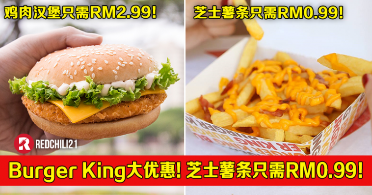 汉堡迷,又有优惠要告诉大家啦!大马 Burger King 推出超值大优惠!芝士薯条只需RM0.99,鸡肉汉堡只需RM2.99!