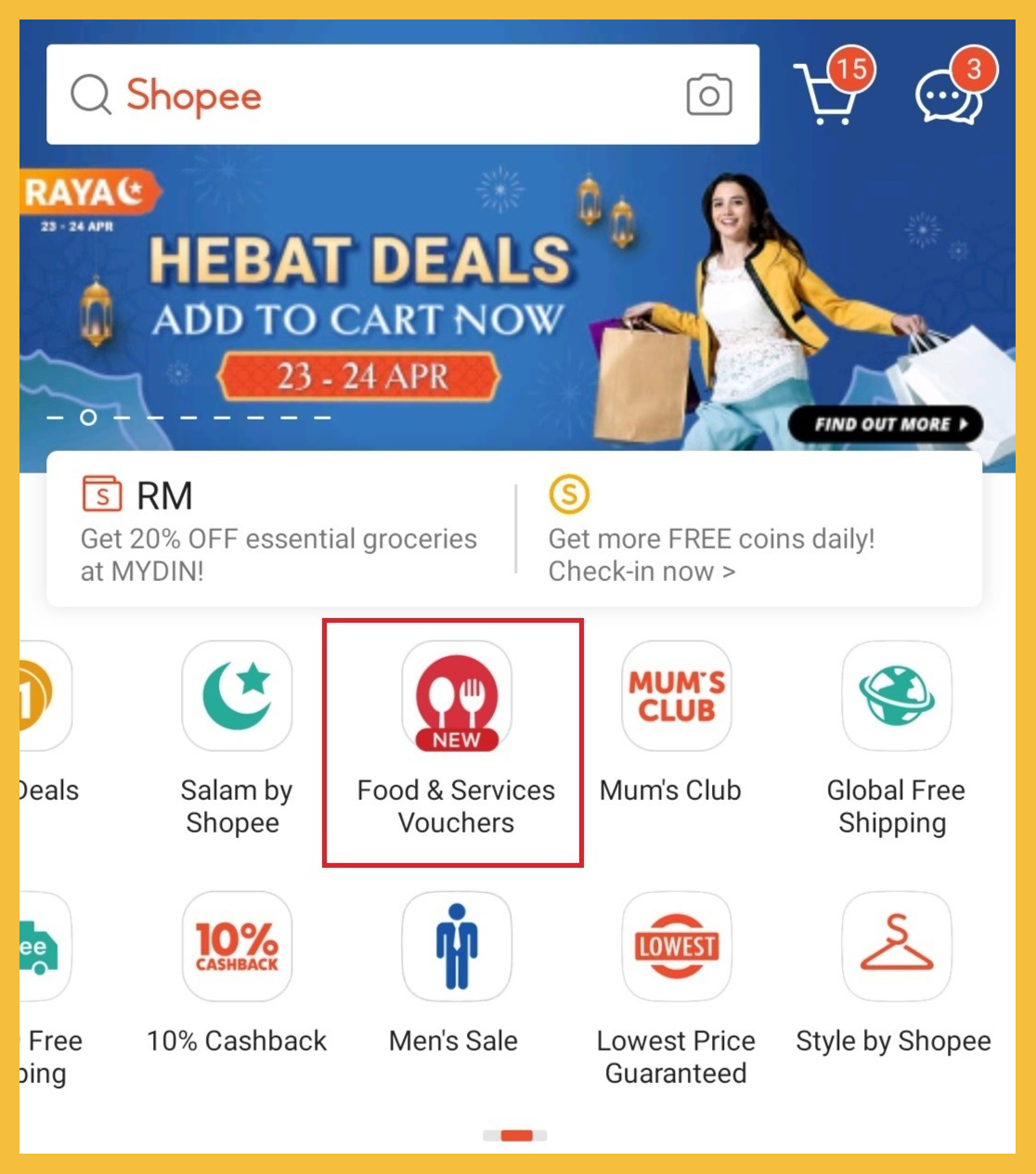 步骤1:打开 Shopee App 点击「Food & Service Voucher 」。