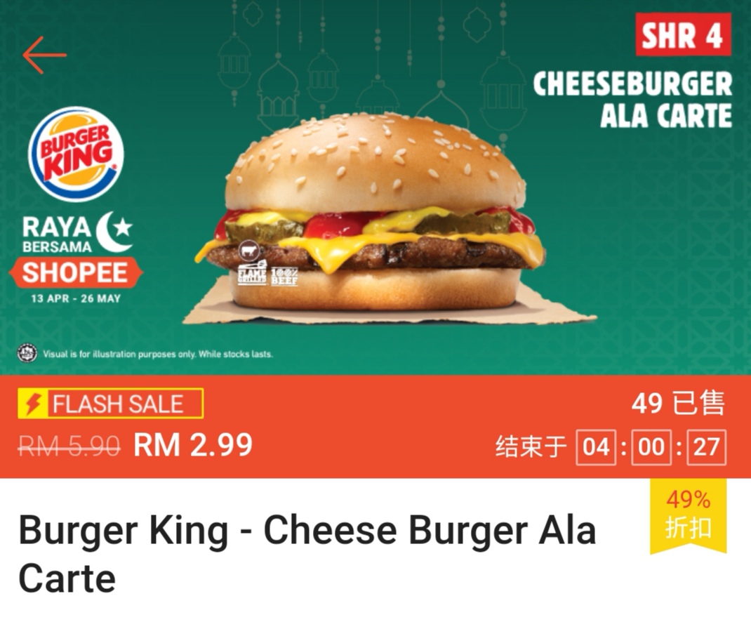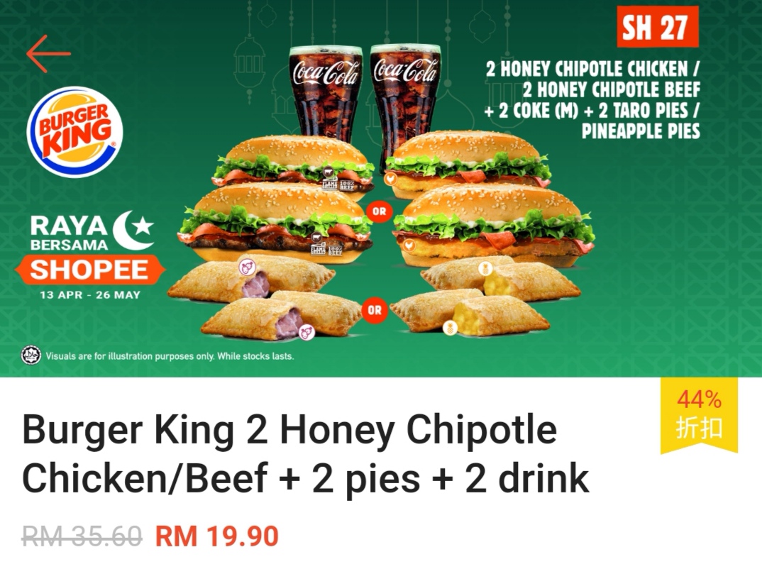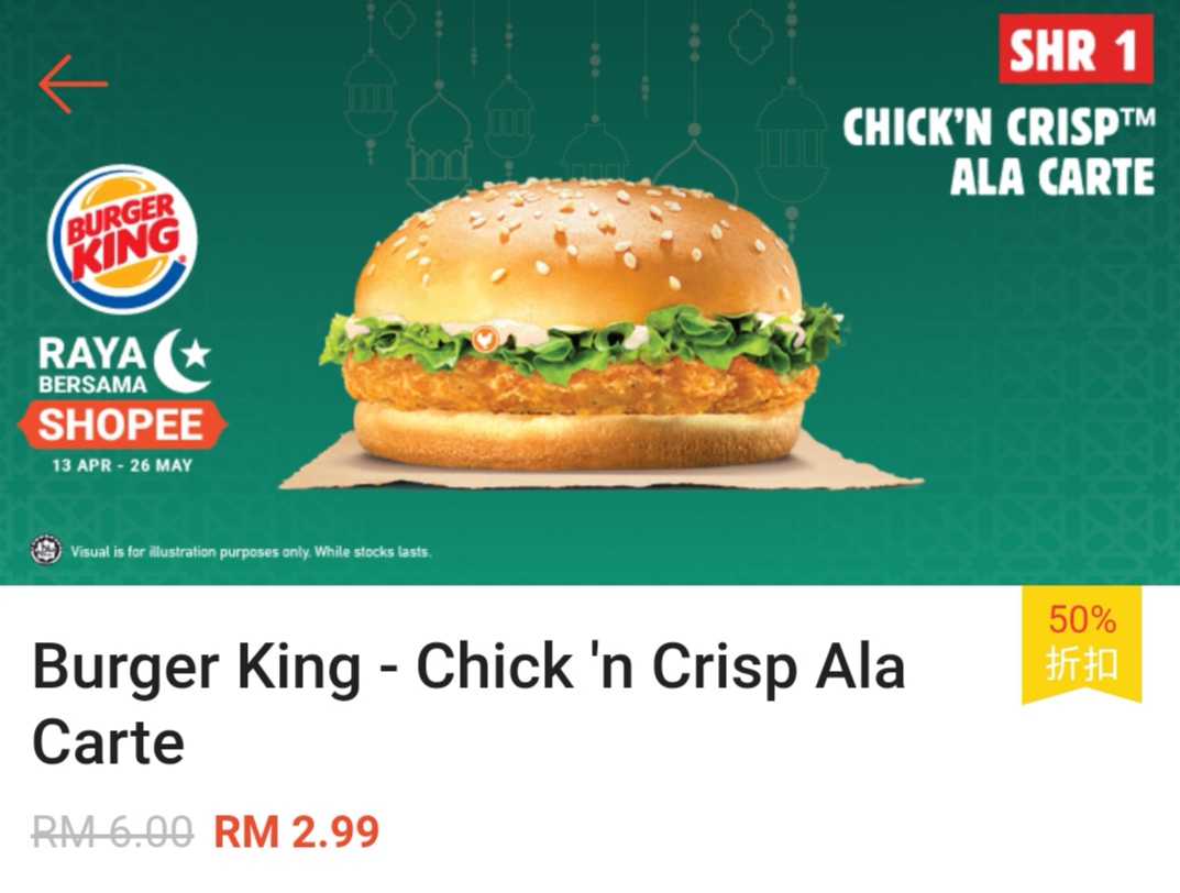为了配合斋戒月的到来,Burger King 与著名网络购物平台 Shopee 推出超值优惠券!喜爱吃Burger King汉堡的你,千万别错过!