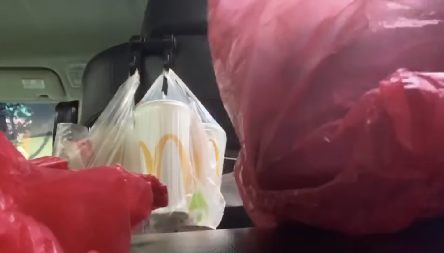 ▼ 影片的一开始,妈妈出门打包麦当劳,为了给家里的孩子惊喜,妈妈特别准备了红色的塑胶袋。用红色的塑胶袋将麦当劳食物装起来,然后带回家。