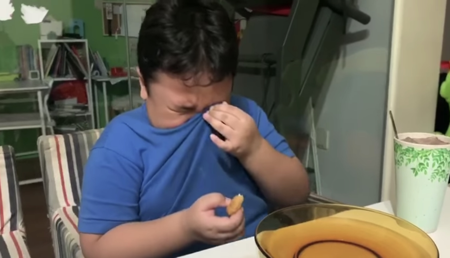 ▼ Adam 擦干眼泪坐下来,拿起 McNugget 咬了以后,就十分珍惜地抱着那一块 McNugget。