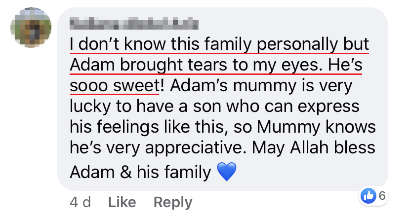 Adam 的妈妈将此事分享在社交媒体,同时也感谢麦当劳的免费餐点!由于送的食物太多,Adam 的妈妈之后决定和周围的邻居共享,一起开心度过这具有特别意义的开斋节。