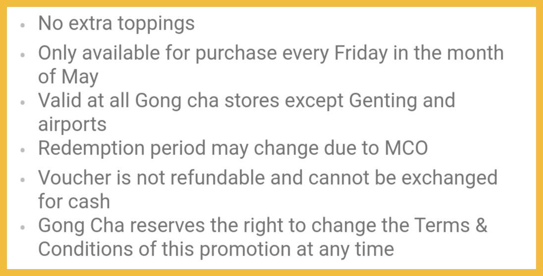 - 可在所有大马 Gong Cha 分行兑换此优惠券,除了Genting 及机场分行