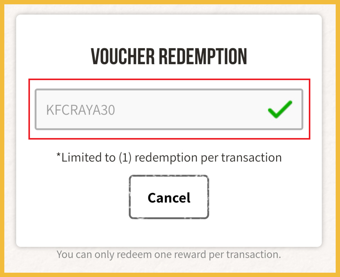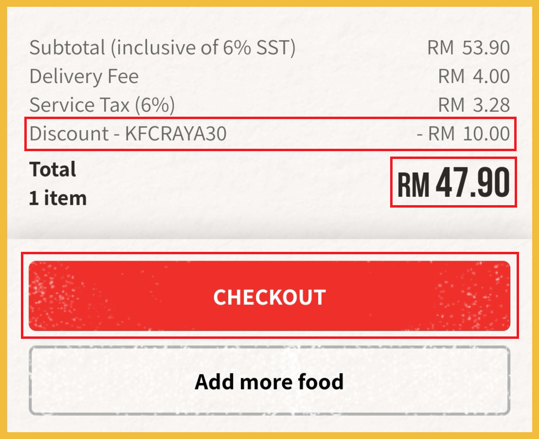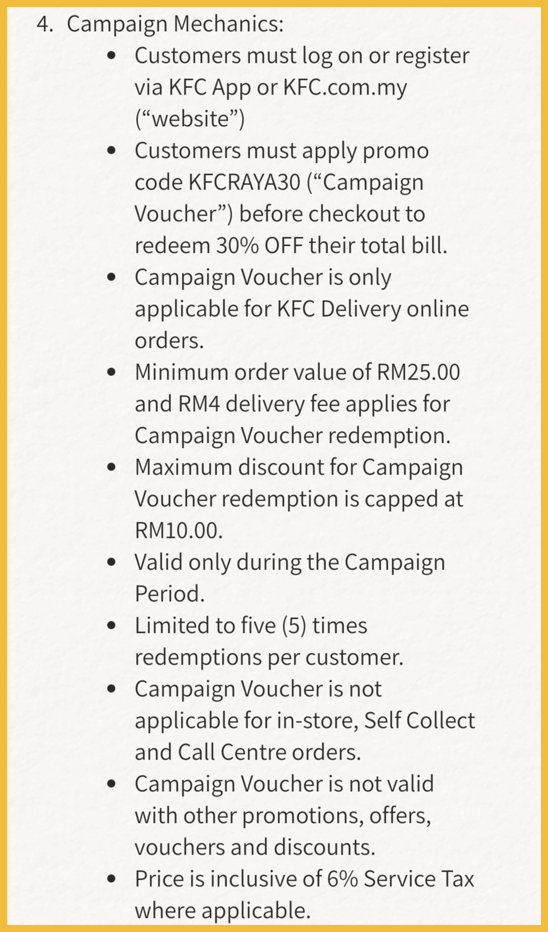 - 必须输入优惠码【KFCRAYA30】,才可获得30%折扣优惠(最高可折扣于RM10)