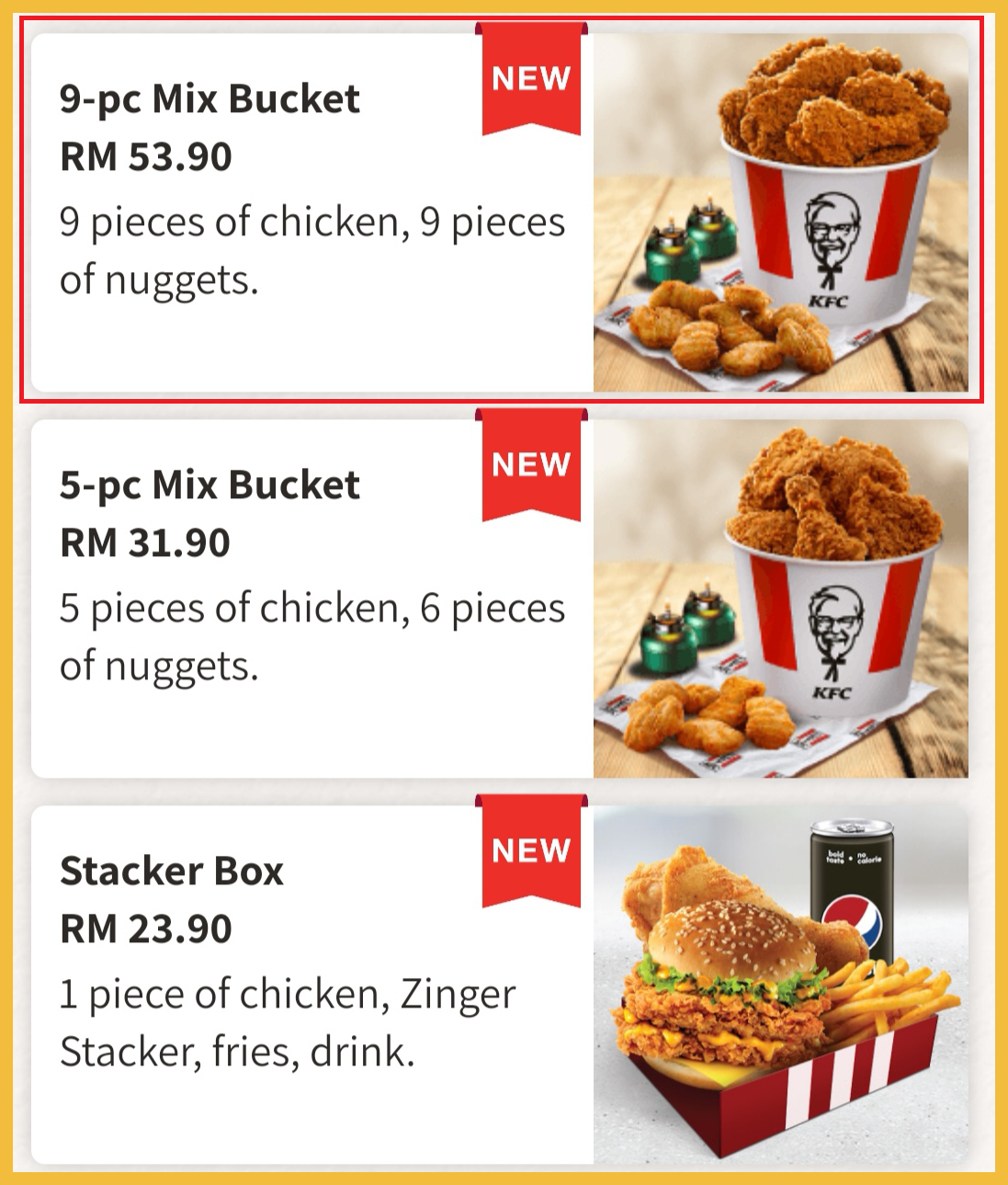 ▼ 步骤 2:选择餐点(需超过 RM25)!比如:1份9块炸鸡的Mix Bucket(原价 RM53.90)。
