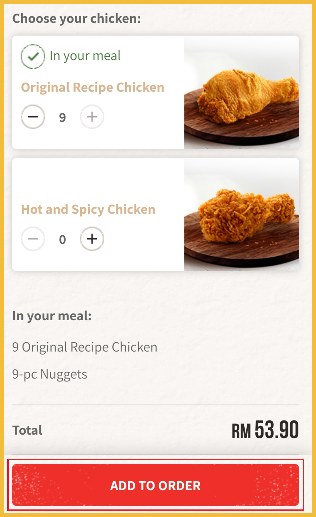 ▼ 步骤 3:选择你想要的炸鸡口味,点击 “ADD TO ORDER” 。