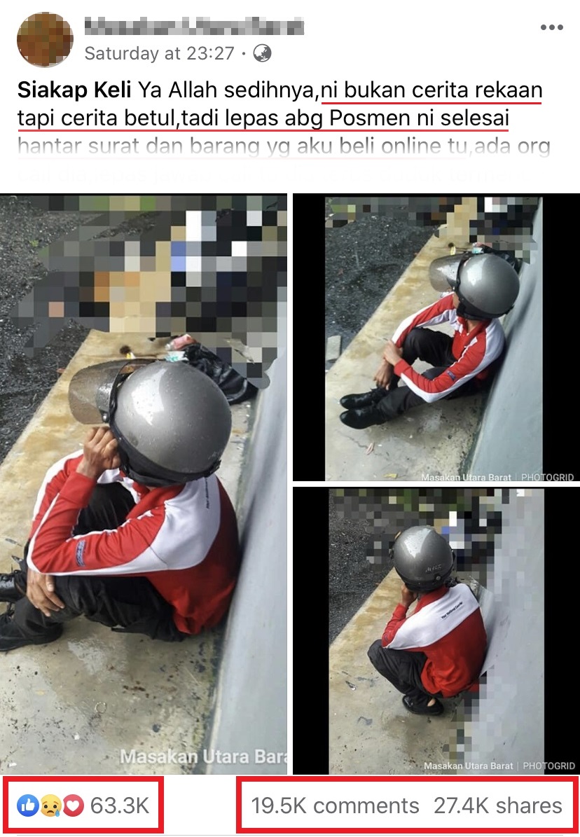 近日一则帖文在面子书疯传并引起网友们的热烈争议,一位邮差坐在路旁难过地流下男儿泪,原因是工作量增加却没有获得花红!