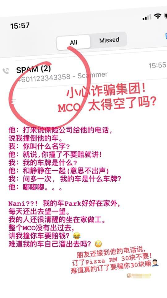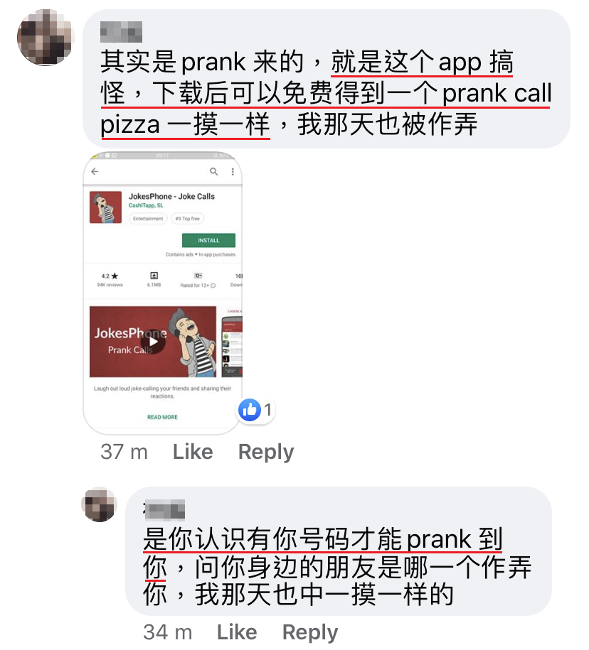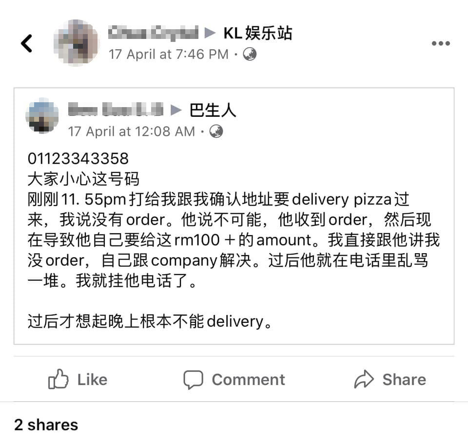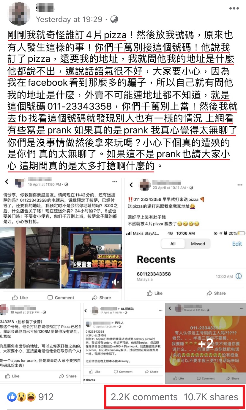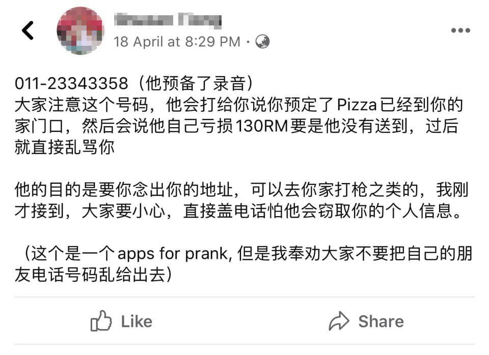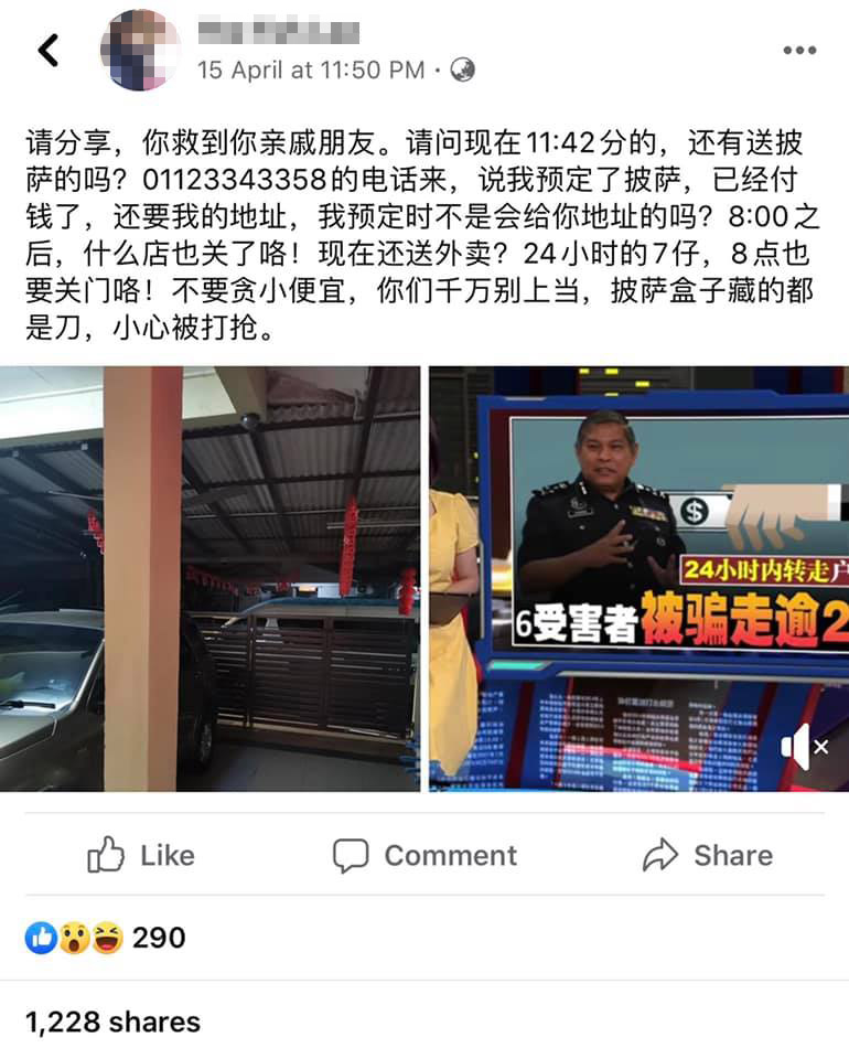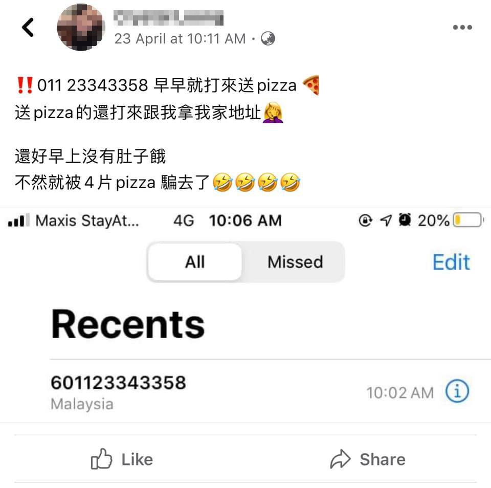 一名大马网友日前在面子书发文警惕大家,突然来了一通电话说「你订了Pizza」,并要求提供住处地址。千万别上当啊!