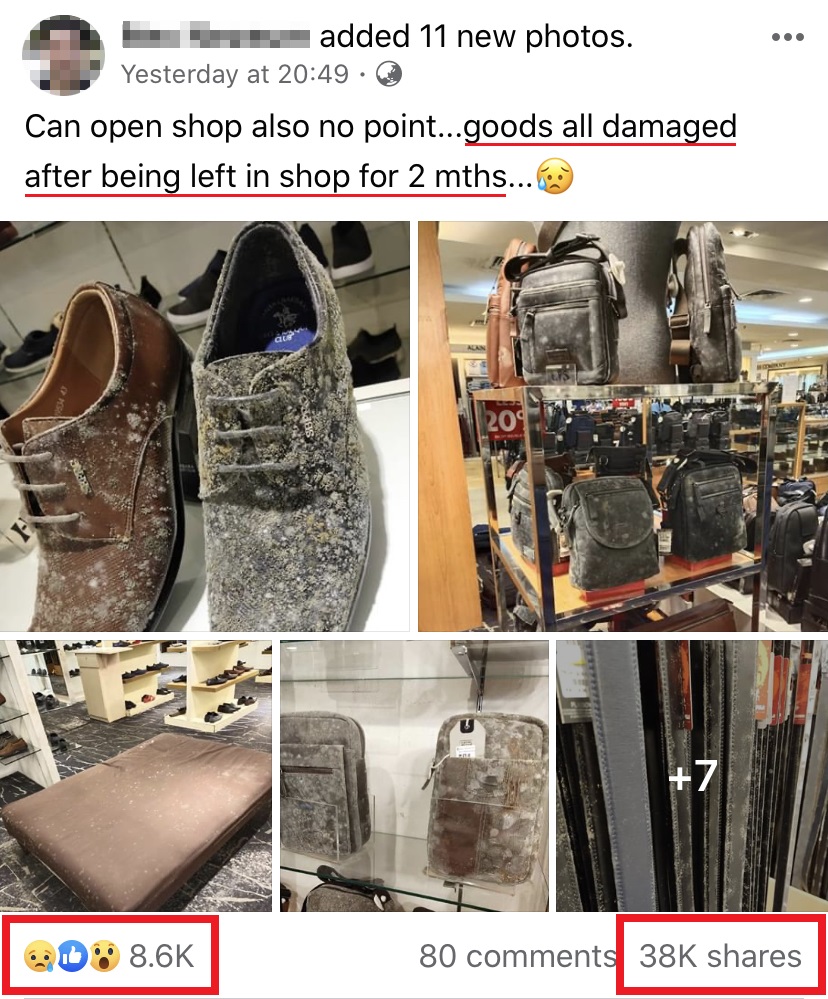 原PO在帖文里写道:「现在可以开店营业了也没用… 货品放在店里长达2个月,现在全部都已经损坏!」