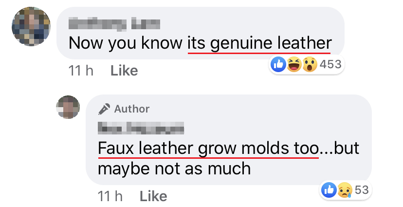 长达将近2个月的行管令,商场无人管理,加上这段期间商场完全没有开门营业,因此帮助除湿的冷气也都关闭。皮制品长久在这样的潮湿环境下,就出现了发霉的情况。
