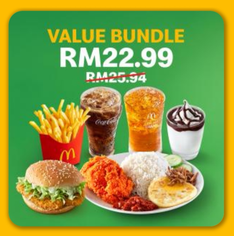 套餐中包括:1份 Nasi Lemak McD Set A(Spicy/Regular)+ 1份McChicken汉堡套餐(M) + 1杯Sundae(草莓/巧克力)