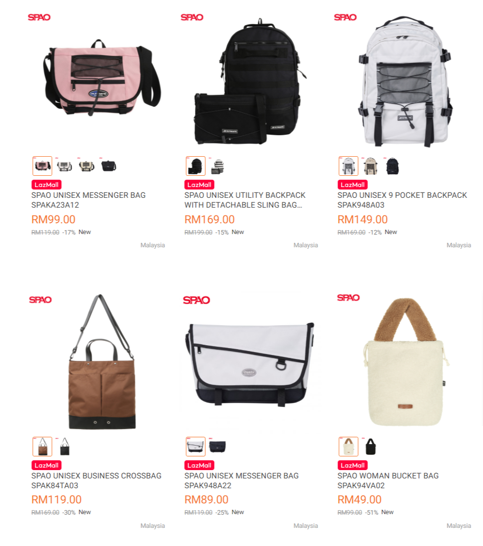 在这次优惠中~ SPAO 与 Lazada 联合推出大促销优惠!不管是男装或女装的衣服、裙子、裤子及包包等等都享有优惠折扣!而且这次 SPAO 背包和Sling Bag 买一送一哦!