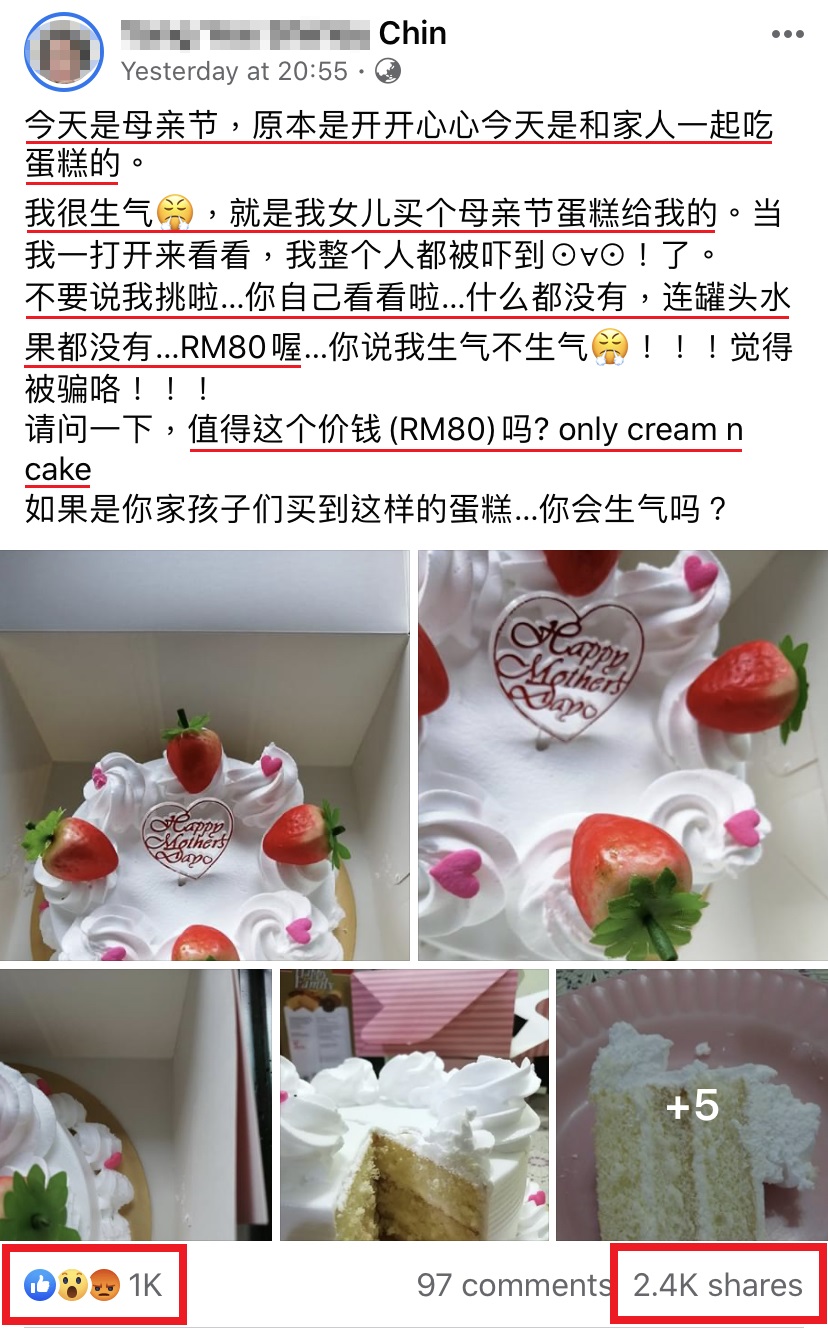 昨天晚上一名来自斗湖(Tawau, Sabah)的妈妈在面子书发文,女儿一片孝心送上母亲节蛋糕给她,没想到花了RM80定制的蛋糕竟然是个“空壳”!