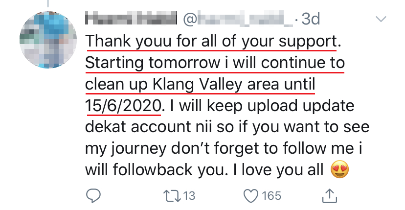 ▼ 该帖文获得许多网友的回响以后,Hazmi 留言感谢大家的支持,同时也表示:「明天开始,我会继续在 Klang Valley 地区捡垃圾,直到2020年6月15日。」