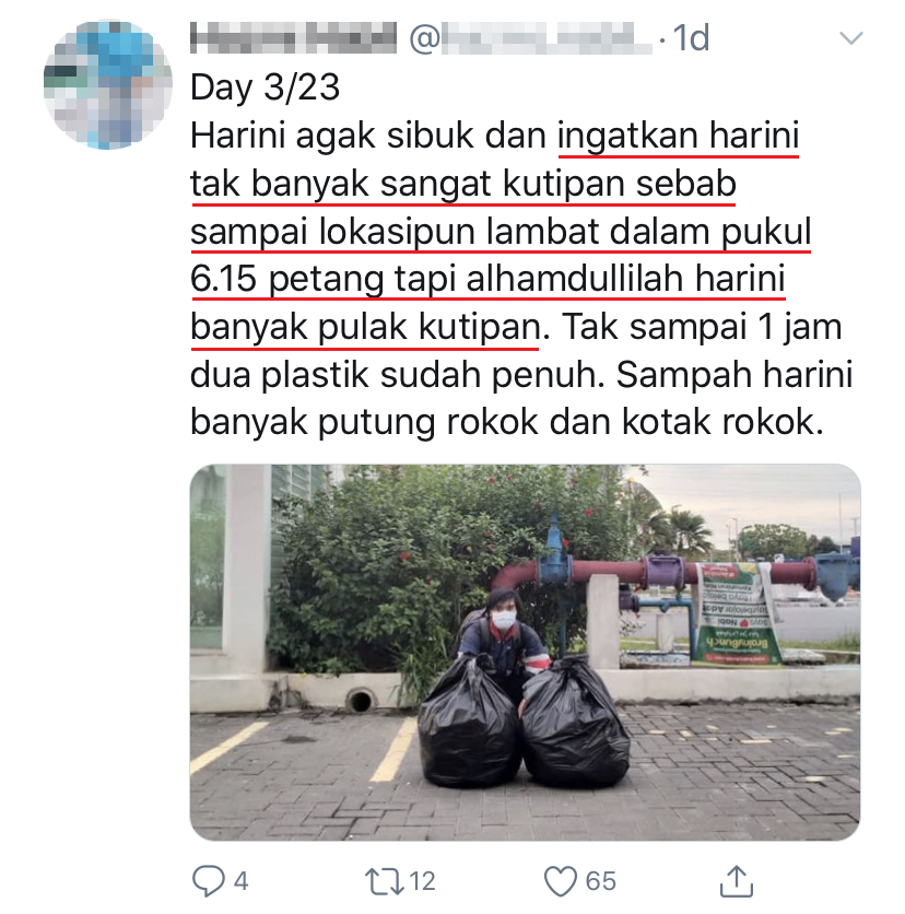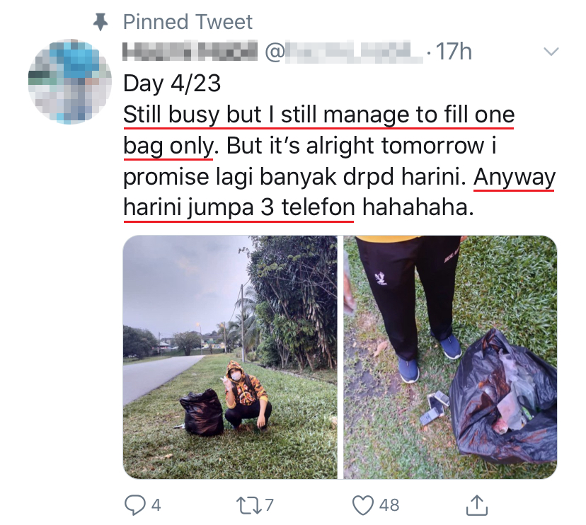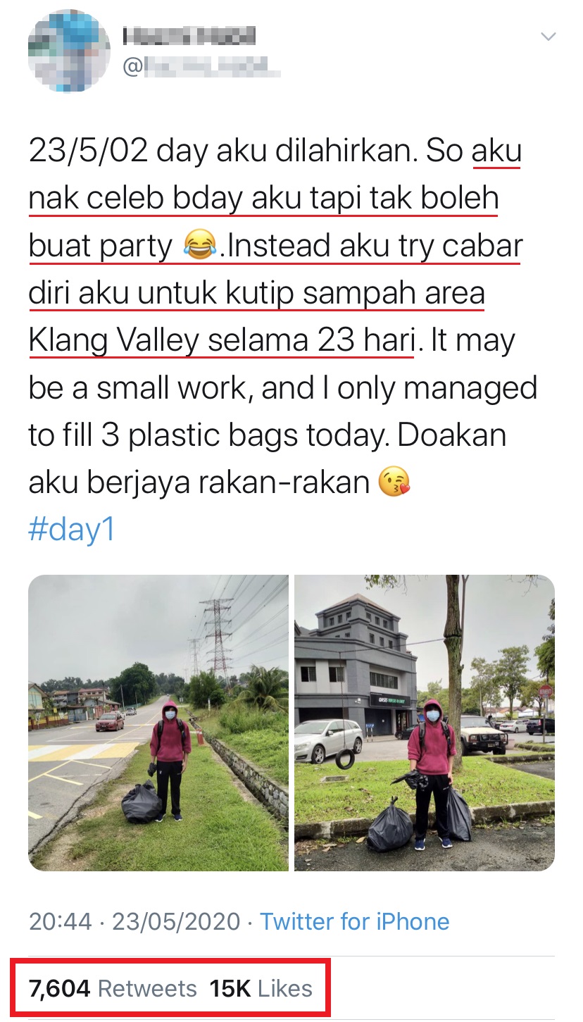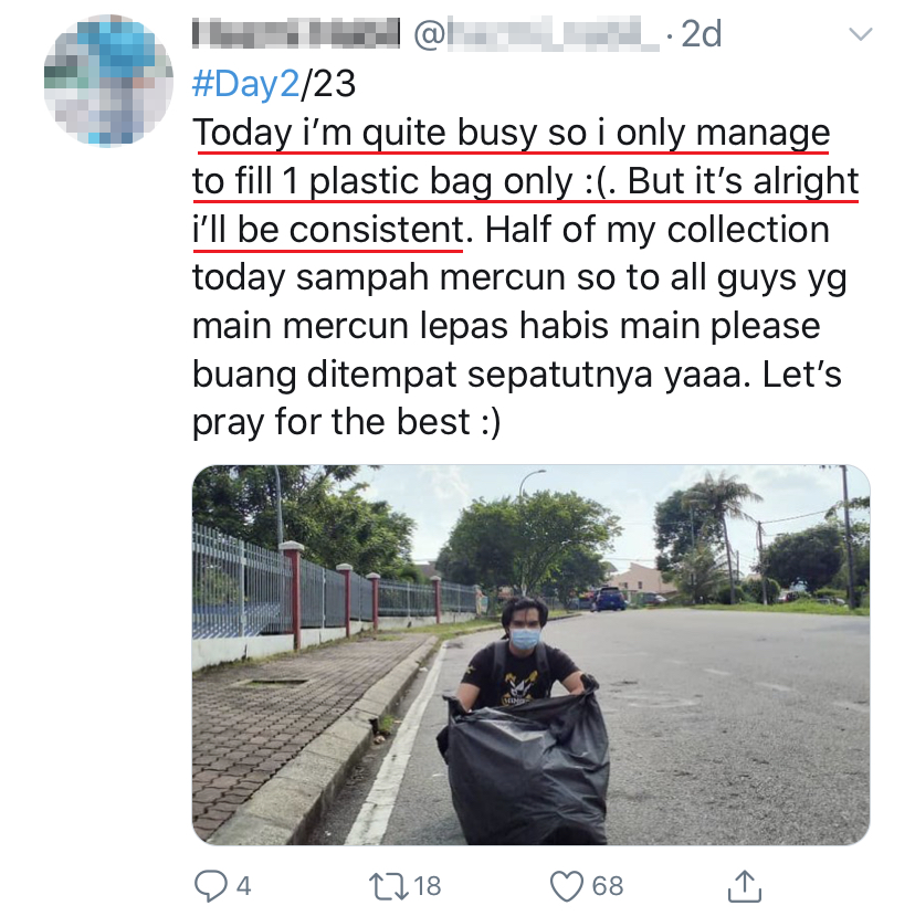 「我出生于2002年5月23日,我想要庆祝生日,奈何行管令期间不能办派对。取而代之的,我决定给自己一个挑战,就是在 Klang Valley 区捡垃圾长达23天。这或许是一份很小的工作,我一天也只能够捡满3个塑胶袋的垃圾。但各位,祝福我成功吧!」