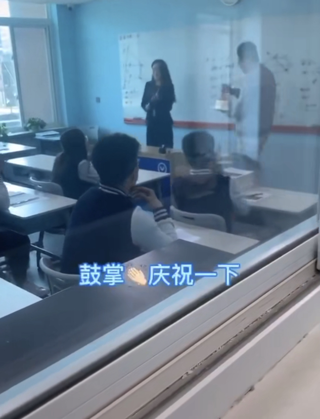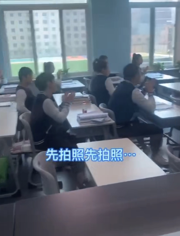 看似温馨感人的一幕,然而接下来却是学生们的“天堂掉入地狱”时刻!听完主任说话以后,学生们在毫无戒备之心的情况下,就不由自主地掏出了偷藏的手机拍照。没想到就在这个时候被“埋伏”已久的校长逮个正着!