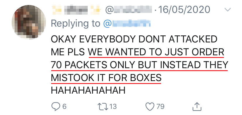 然而开斋节的前一个星期,一名女子就发文请求网友们的协助。她的叔叔在网上购买 Keropok 的时候,和卖家出现了沟通问题,导致卖家误会,将70包的订单听成了70箱!